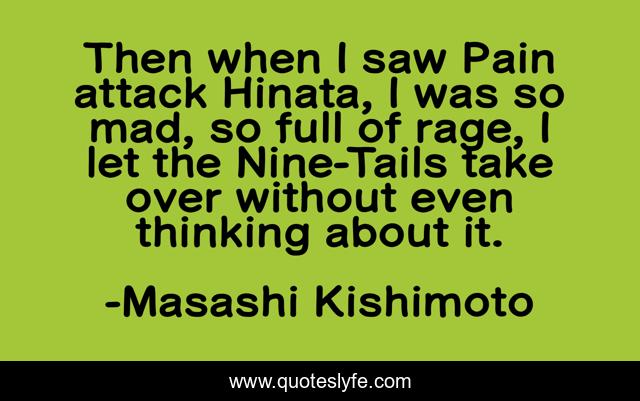 This page presents the quote "Then when I saw Pain attack Hinata, I was so mad, so full of rage, I let the Nine-Tails take over without even thinking about it.". Author of this quote is Masashi Kishimoto. This quote is about naruto, kyuubi, pain, hinata,.