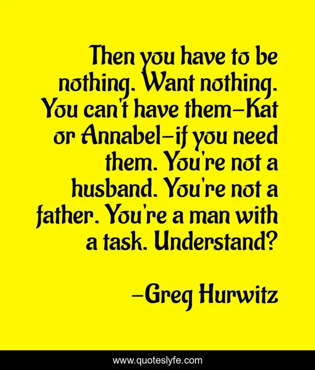 This page presents the quote "Then you have to be nothing. Want nothing. You can't have them-Kat or Annabel-if you need them. You're not a husband. You're not a father. You're a man with a task. Understand?". Author of this quote is Greg Hurwitz. This quote is about discipline, you-re-next, character, focus, gregg-hurwitz,.