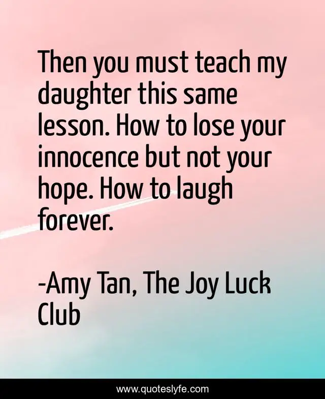 This page presents the quote "Then you must teach my daughter this same lesson. How to lose your innocence but not your hope. How to laugh forever.". Author of this quote is Amy Tan, The Joy Luck Club. .