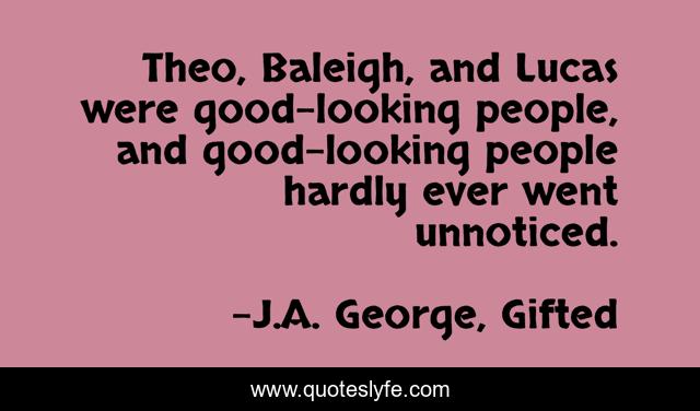This page presents the quote "Theo, Baleigh, and Lucas were good-looking people, and good-looking people hardly ever went unnoticed.". Author of this quote is J.A. George, Gifted. This quote is about good-looking, young-adult, attractive,.