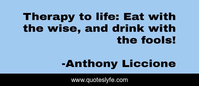 This page presents the quote "Therapy to life: Eat with the wise, and drink with the fools!". Author of this quote is Anthony Liccione. This quote is about lessons, content, food-for-thought, company, drunkeness, therapy, relaxation, medicine, fools,.