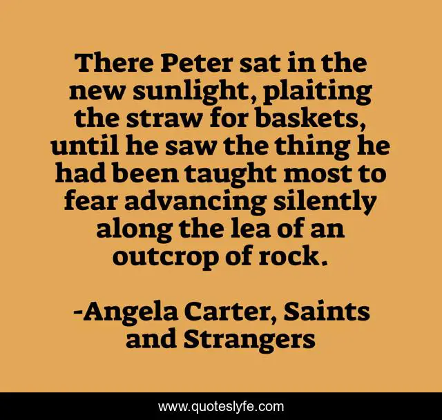 This page presents the quote "There Peter sat in the new sunlight, plaiting the straw for baskets, until he saw the thing he had been taught most to fear advancing silently along the lea of an outcrop of rock.". Author of this quote is Angela Carter, Saints and Strangers. This quote is about literature, peter-and-the-wolf, angela-carter, fiction, gothic, saints-and-strangers,.