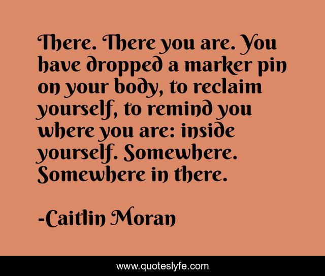 This page presents the quote "There. There you are. You have dropped a marker pin on your body, to reclaim yourself, to remind you where you are: inside yourself. Somewhere. Somewhere in there.". Author of this quote is Caitlin Moran. This quote is about enthusiasm, feminism, love, inspirational, affection,.