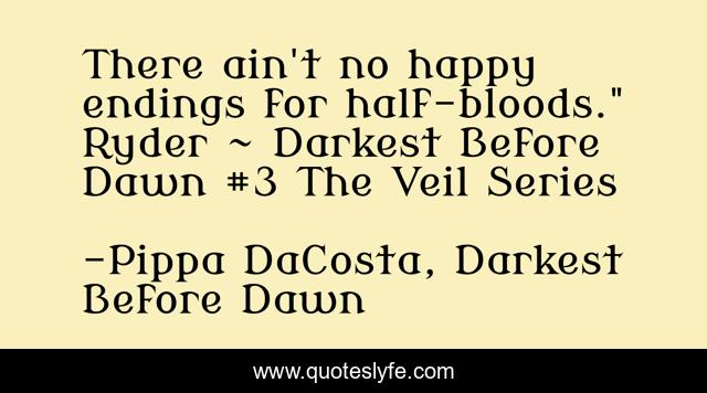 This page presents the quote "There ain't no happy endings for half-bloods." Ryder ~ Darkest Before Dawn #3 The Veil Series". Author of this quote is Pippa DaCosta, Darkest Before Dawn. This quote is about darkest-before-dawn, the-veil-series, urban-fantasy, ryder, beyond-the-veil,.