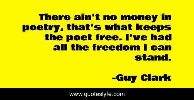 This page presents the quote "There ain't no money in poetry, that's what keeps the poet free. I've had all the freedom I can stand.". Author of this quote is Guy Clark. This quote is about freedom, lyric, poetry, lyrics, money,.