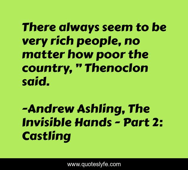 This page presents the quote "There always seem to be very rich people, no matter how poor the country, ” Thenoclon said.". Author of this quote is Andrew Ashling, The Invisible Hands - Part 2: Castling. This quote is about disparity-of-wealth, rich-people, rich, poor-countries,.