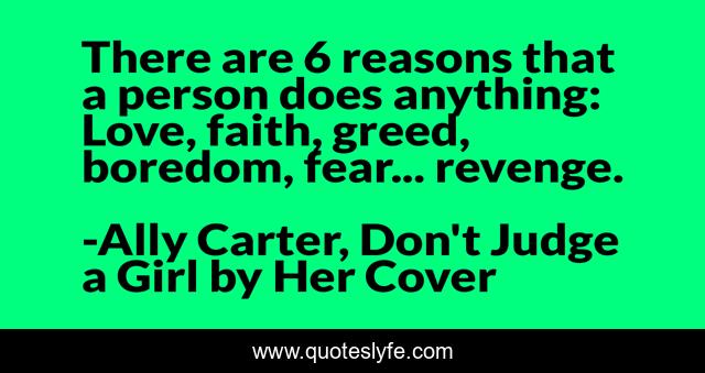 This page presents the quote "There are 6 reasons that a person does anything: Love, faith, greed, boredom, fear... revenge.". Author of this quote is Ally Carter, Don't Judge a Girl by Her Cover. This quote is about faith, love, revenge, boredom, greed, fear, affection,.