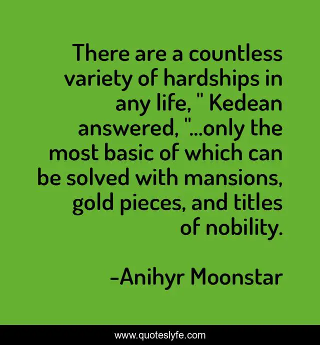 This page presents the quote "There are a countless variety of hardships in any life, " Kedean answered, "...only the most basic of which can be solved with mansions, gold pieces, and titles of nobility.". Author of this quote is Anihyr Moonstar. This quote is about life, solutions, security, hardships,.