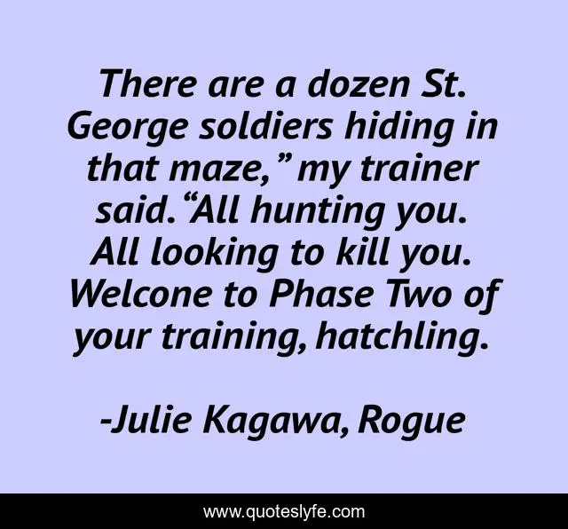 This page presents the quote "There are a dozen St. George soldiers hiding in that maze, ” my trainer said. “All hunting you. All looking to kill you. Welcone to Phase Two of your training, hatchling.". Author of this quote is Julie Kagawa, Rogue. .