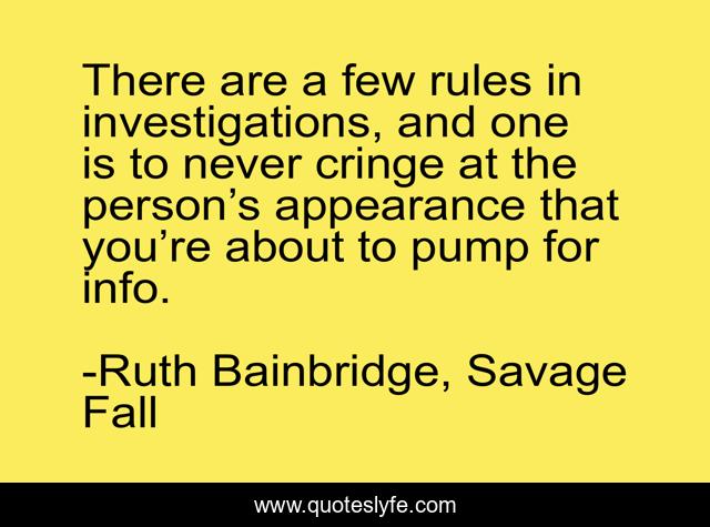 This page presents the quote "There are a few rules in investigations, and one is to never cringe at the person’s appearance that you’re about to pump for info.". Author of this quote is Ruth Bainbridge, Savage Fall. This quote is about noir-mystery, mystery-series, coffee, mystery-thriller, thriller,.