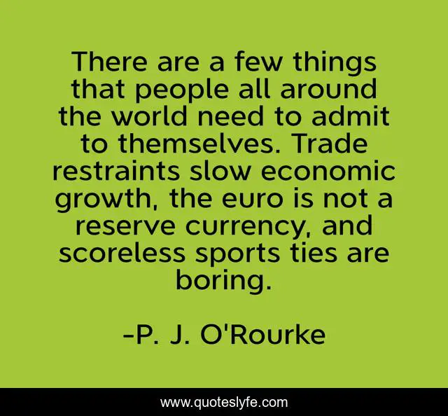 This page presents the quote "There are a few things that people all around the world need to admit to themselves. Trade restraints slow economic growth, the euro is not a reserve currency, and scoreless sports ties are boring.". Author of this quote is P. J. O'Rourke. This quote is about world, growth, people,.