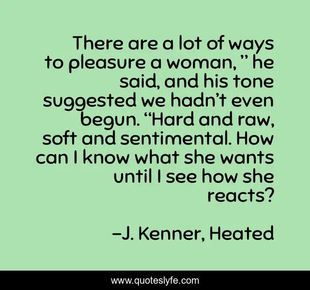 This page presents the quote "There are a lot of ways to pleasure a woman, ” he said, and his tone suggested we hadn’t even begun. “Hard and raw, soft and sentimental. How can I know what she wants until I see how she reacts?". Author of this quote is J. Kenner, Heated. This quote is about romance, erotica, adult-fiction,.