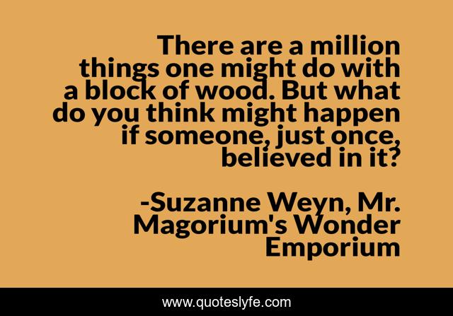 This page presents the quote "There are a million things one might do with a block of wood. But what do you think might happen if someone, just once, believed in it?". Author of this quote is Suzanne Weyn, Mr. Magorium's Wonder Emporium. This quote is about believe, inspire, magorium,.