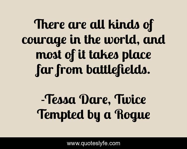 This page presents the quote "There are all kinds of courage in the world, and most of it takes place far from battlefields.". Author of this quote is Tessa Dare, Twice Tempted by a Rogue. This quote is about battlefield, courage, simple-courage, world,.