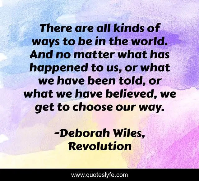 This page presents the quote "There are all kinds of ways to be in the world. And no matter what has happened to us, or what we have been told, or what we have believed, we get to choose our way.". Author of this quote is Deborah Wiles, Revolution. This quote is about civil-rights, equality,.