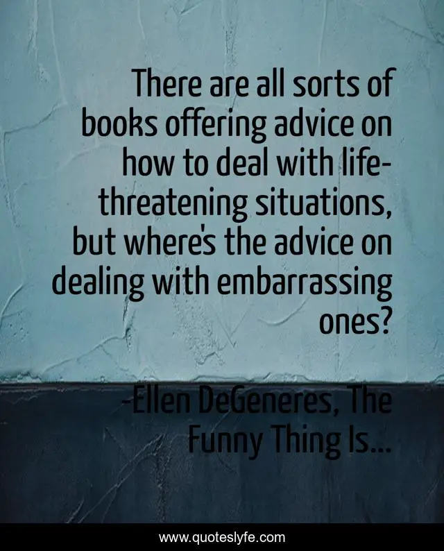 This page presents the quote "There are all sorts of books offering advice on how to deal with life-threatening situations, but where's the advice on dealing with embarrassing ones?". Author of this quote is Ellen DeGeneres, The Funny Thing Is.... This quote is about funny, advice, comedy, embarrassing,.
