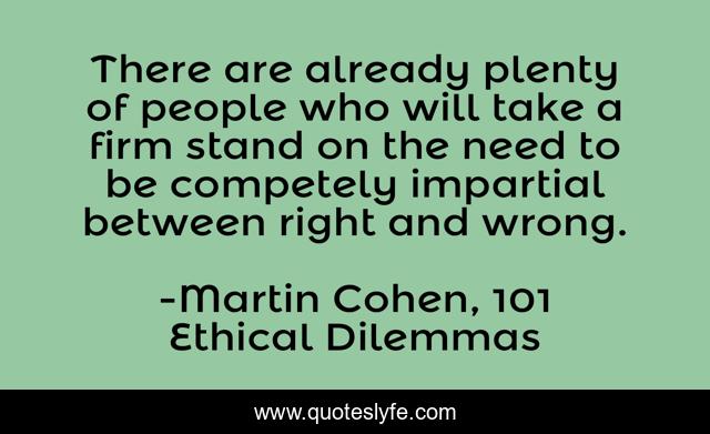 This page presents the quote "There are already plenty of people who will take a firm stand on the need to be competely impartial between right and wrong.". Author of this quote is Martin Cohen, 101 Ethical Dilemmas. This quote is about dilemmas, philosophy, ethics, values-in-life,.