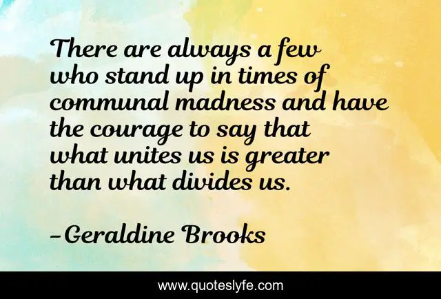 This page presents the quote "There are always a few who stand up in times of communal madness and have the courage to say that what unites us is greater than what divides us.". Author of this quote is Geraldine Brooks. This quote is about madness, stand, stand up,.
