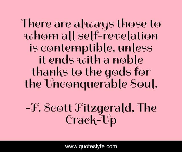 This page presents the quote "There are always those to whom all self-revelation is contemptible, unless it ends with a noble thanks to the gods for the Unconquerable Soul.". Author of this quote is F. Scott Fitzgerald, The Crack-Up. This quote is about depression, self-revelation,.