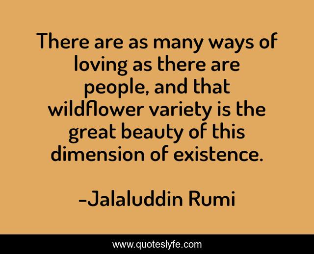 This page presents the quote "There are as many ways of loving as there are people, and that wildflower variety is the great beauty of this dimension of existence.". Author of this quote is Jalaluddin Rumi. This quote is about existence, wildflowers, love, affection, variety,.