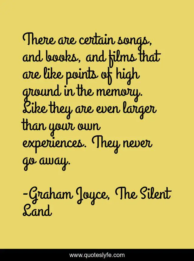 This page presents the quote "There are certain songs, and books, and films that are like points of high ground in the memory. Like they are even larger than your own experiences. They never go away.". Author of this quote is Graham Joyce, The Silent Land. .