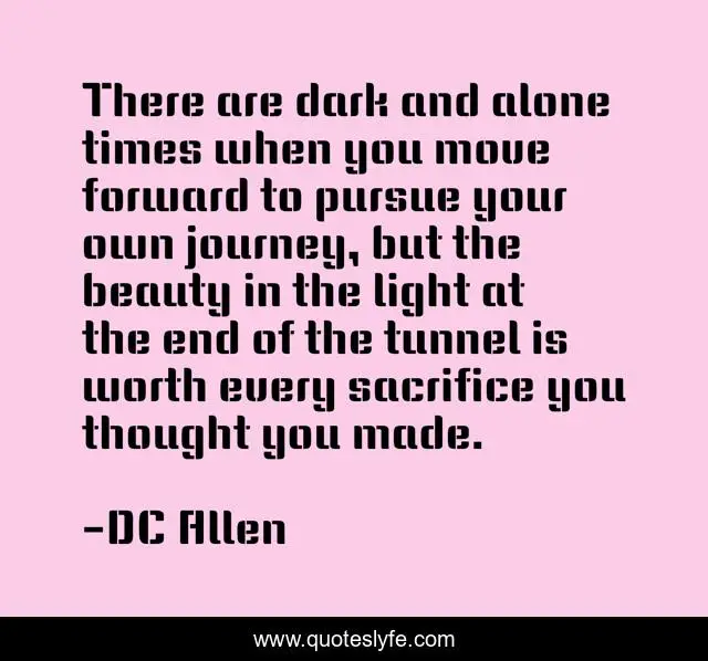 This page presents the quote "There are dark and alone times when you move forward to pursue your own journey, but the beauty in the light at the end of the tunnel is worth every sacrifice you thought you made.". Author of this quote is DC Allen. This quote is about pursue-a-passion, life, journey, feeling-alone,.