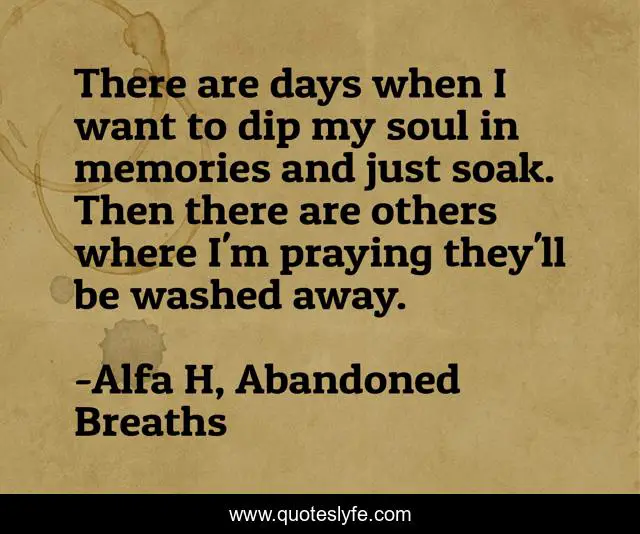 This page presents the quote "There are days when I want to dip my soul in memories and just soak. Then there are others where I'm praying they'll be washed away.". Author of this quote is Alfa H, Abandoned Breaths. This quote is about relationships, life, love, memories, poetry, affection,.