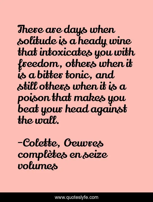 This page presents the quote "There are days when solitude is a heady wine that intoxicates you with freedom, others when it is a bitter tonic, and still others when it is a poison that makes you beat your head against the wall.". Author of this quote is Colette, Oeuvres complètes en seize volumes. This quote is about solitude, wine,.