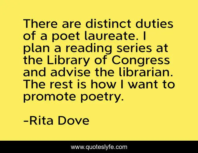 This page presents the quote "There are distinct duties of a poet laureate. I plan a reading series at the Library of Congress and advise the librarian. The rest is how I want to promote poetry.". Author of this quote is Rita Dove. This quote is about reading, plan, library,.