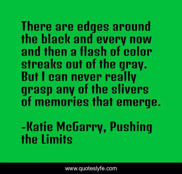 This page presents the quote "There are edges around the black and every now and then a flash of color streaks out of the gray. But I can never really grasp any of the slivers of memories that emerge.". Author of this quote is Katie McGarry, Pushing the Limits. This quote is about remembering, memory-loss, remember, traumatic, memories, sadness, trauma, ptsd, depression,.