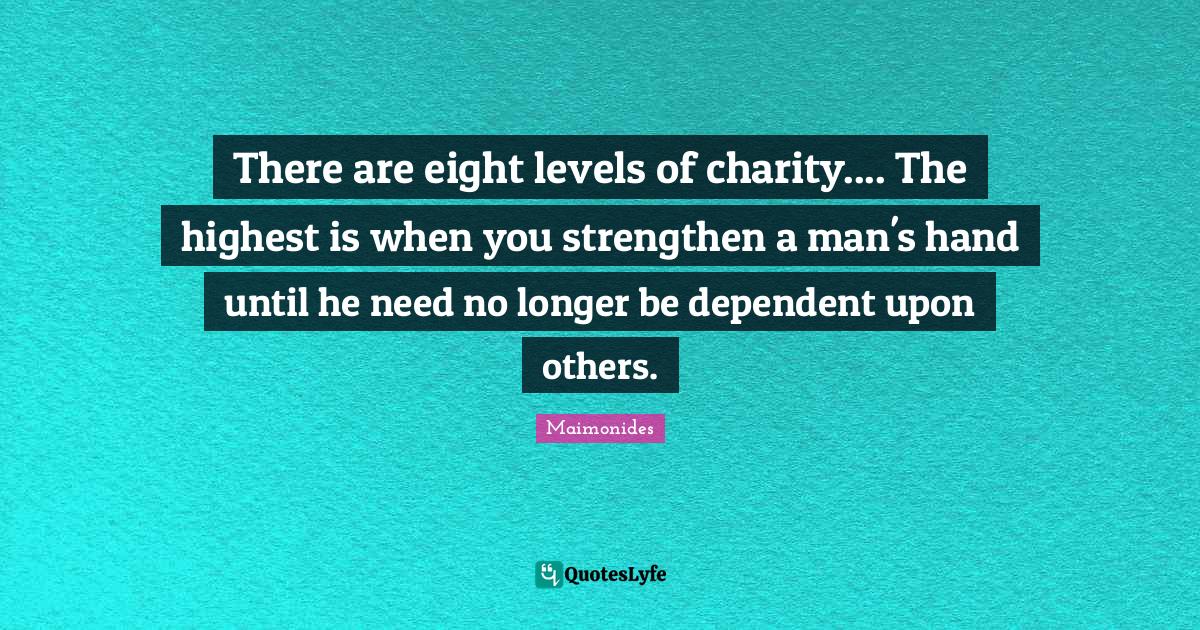 This page presents the quote "There are eight levels of charity.... The highest is when you strengthen a man's hand until he need no longer be dependent upon others.". Author of this quote is Maimonides. This quote is about dependent, men, hands, levels, highest, charity, eight,.
