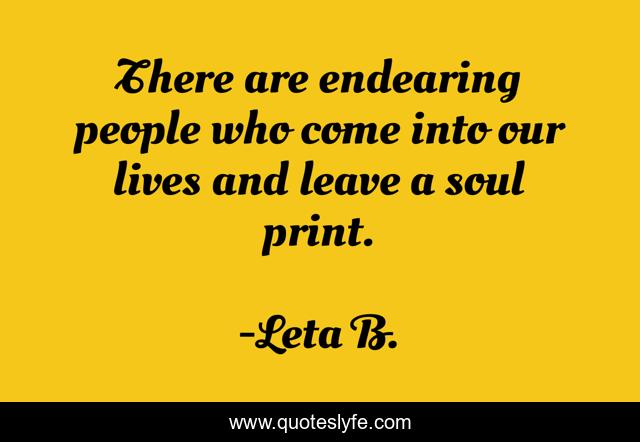 This page presents the quote "There are endearing people who come into our lives and leave a soul print.". Author of this quote is Leta B.. This quote is about inspirational-life, spirituality, soul,.
