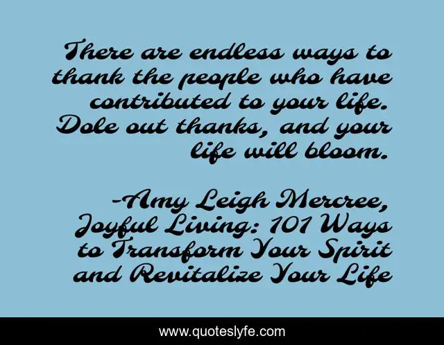 This page presents the quote "There are endless ways to thank the people who have contributed to your life. Dole out thanks, and your life will bloom.". Author of this quote is Amy Leigh Mercree, Joyful Living: 101 Ways to Transform Your Spirit and Revitalize Your Life. This quote is about life, quotes-de-la-vida, amy-leigh-mercree, quote-of-the-day, quote-about-life, joyful-living, thankful, thank-you, joyful-living-101,.