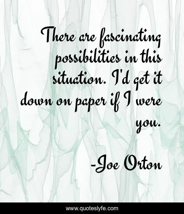 This page presents the quote "There are fascinating possibilities in this situation. I'd get it down on paper if I were you.". Author of this quote is Joe Orton. This quote is about irony, humor, writing,.