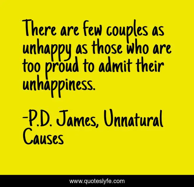 This page presents the quote "There are few couples as unhappy as those who are too proud to admit their unhappiness.". Author of this quote is P.D. James, Unnatural Causes. This quote is about couples, pride, love, affection, unhappiness,.