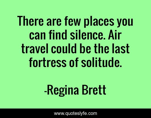 This page presents the quote "There are few places you can find silence. Air travel could be the last fortress of solitude.". Author of this quote is Regina Brett. This quote is about solitude, silence,.