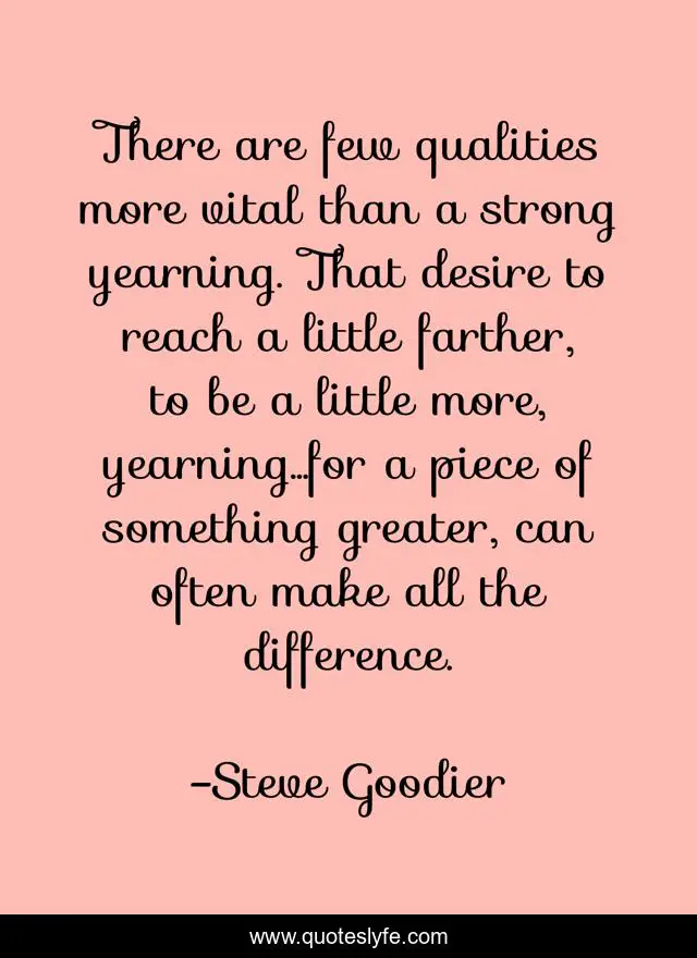 This page presents the quote "There are few qualities more vital than a strong yearning. That desire to reach a little farther, to be a little more, yearning...for a piece of something greater, can often make all the difference.". Author of this quote is Steve Goodier. This quote is about desire, success, behaviour, yearning, attitude, dreaming, achievement,.