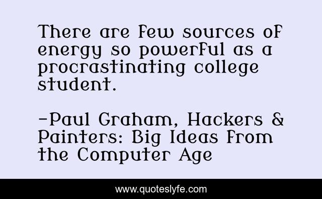 This page presents the quote "There are few sources of energy so powerful as a procrastinating college student.". Author of this quote is Paul Graham, Hackers & Painters: Big Ideas from the Computer Age. This quote is about humor, hackers, painters, inspirational, enthusiasm, paul, graham,.