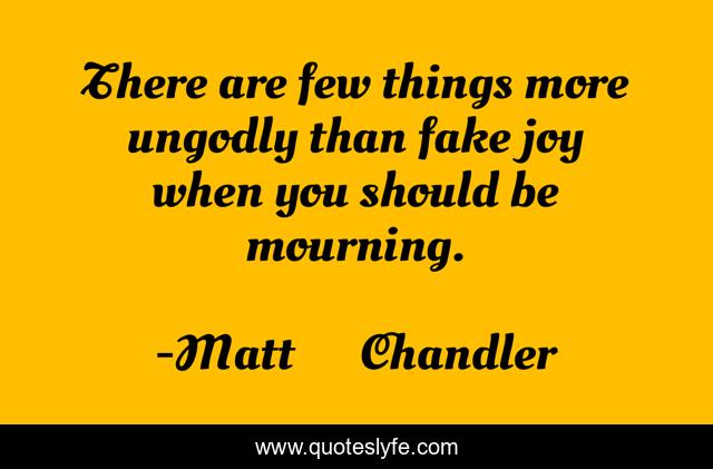 This page presents the quote "There are few things more ungodly than fake joy when you should be mourning.". Author of this quote is Matt Chandler. This quote is about community, sadness, transparency, authenticity, sin, depression,.