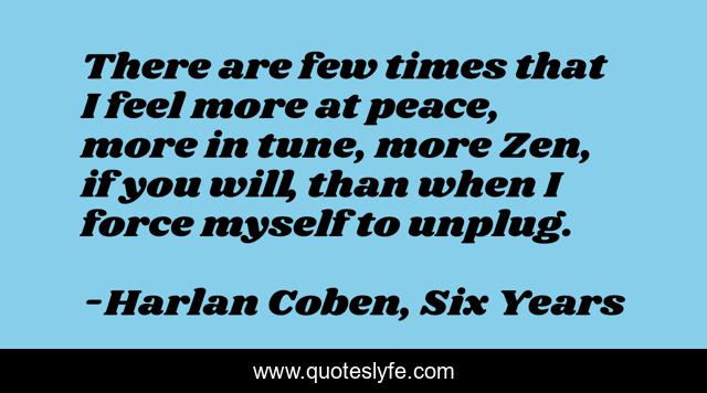 This page presents the quote "There are few times that I feel more at peace, more in tune, more Zen, if you will, than when I force myself to unplug.". Author of this quote is Harlan Coben, Six Years. This quote is about peace, technology-addiction, internet,.