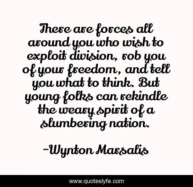 This page presents the quote "There are forces all around you who wish to exploit division, rob you of your freedom, and tell you what to think. But young folks can rekindle the weary spirit of a slumbering nation.". Author of this quote is Wynton Marsalis. This quote is about wish, think,.