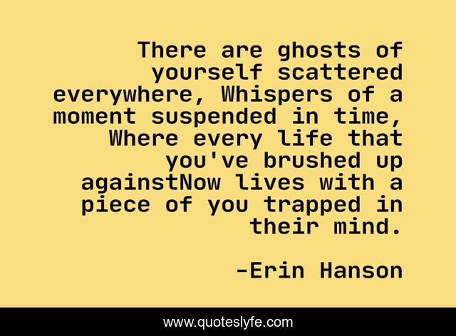 This page presents the quote "There are ghosts of yourself scattered everywhere, Whispers of a moment suspended in time, Where every life that you've brushed up againstNow lives with a piece of you trapped in their mind.". Author of this quote is Erin Hanson. This quote is about past, memories, history,.