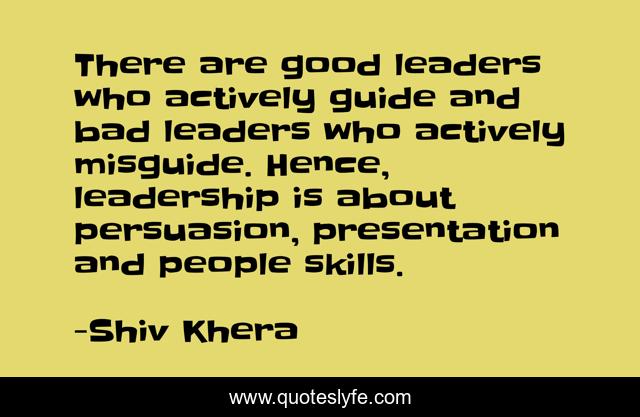 This page presents the quote "There are good leaders who actively guide and bad leaders who actively misguide. Hence, leadership is about persuasion, presentation and people skills.". Author of this quote is Shiv Khera. This quote is about leadership, people,.