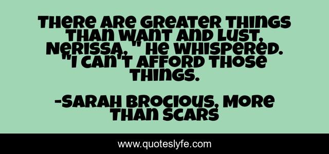 This page presents the quote "There are greater things than want and lust, Nerissa, " he whispered. "I can't afford those things.". Author of this quote is Sarah Brocious, More Than Scars. This quote is about lust, wanting, trust, love, affection,.