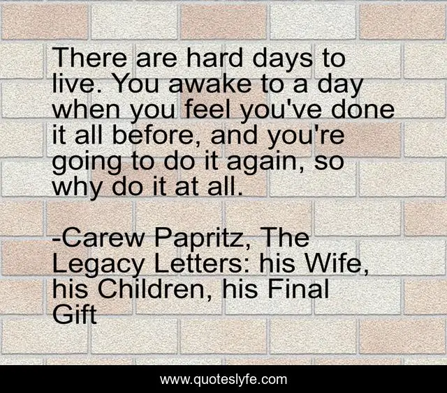This page presents the quote "There are hard days to live. You awake to a day when you feel you've done it all before, and you're going to do it again, so why do it at all.". Author of this quote is Carew Papritz, The Legacy Letters: his Wife, his Children, his Final Gift. This quote is about living, life, lifequotes, read, bookquotes, quotes, book, the-legacy-letters, carew-papritz,.