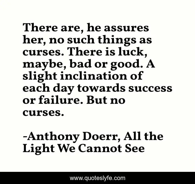 This page presents the quote "There are, he assures her, no such things as curses. There is luck, maybe, bad or good. A slight inclination of each day towards success or failure. But no curses.". Author of this quote is Anthony Doerr, All the Light We Cannot See. .
