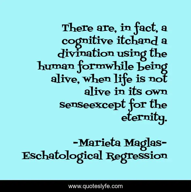 This page presents the quote "There are, in fact, a cognitive itchand a divination using the human formwhile being alive, when life is not alive in its own senseexcept for the eternity.". Author of this quote is Marieta Maglas- Eschatological Regression. This quote is about eternity, life, cognitive, alive, divination,.