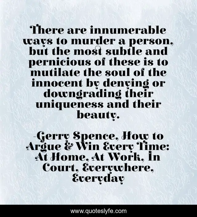 This page presents the quote "There are innumerable ways to murder a person, but the most subtle and pernicious of these is to mutilate the soul of the innocent by denying or downgrading their uniqueness and their beauty.". Author of this quote is Gerry Spence, How to Argue & Win Every Time: At Home, At Work, In Court, Everywhere, Everyday. This quote is about murder, beauty, justice, lies, defense, injustice, innocence,.