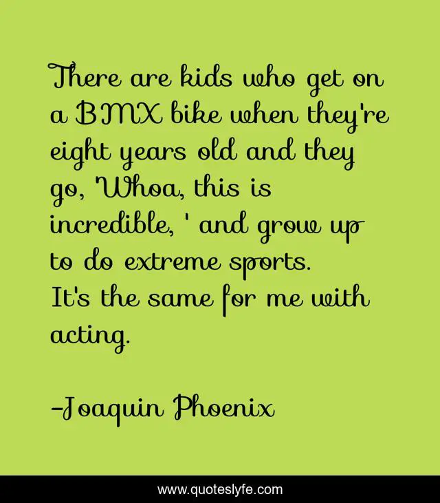 This page presents the quote "There are kids who get on a BMX bike when they're eight years old and they go, 'Whoa, this is incredible, ' and grow up to do extreme sports. It's the same for me with acting.". Author of this quote is Joaquin Phoenix. This quote is about me, acting, bike,.