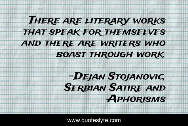 This page presents the quote "There are literary works that speak for themselves and there are writers who boast through work.". Author of this quote is Dejan Stojanovic, Serbian Satire and Aphorisms. This quote is about dejan-stojanovic, writers, boasting, literary-works,.